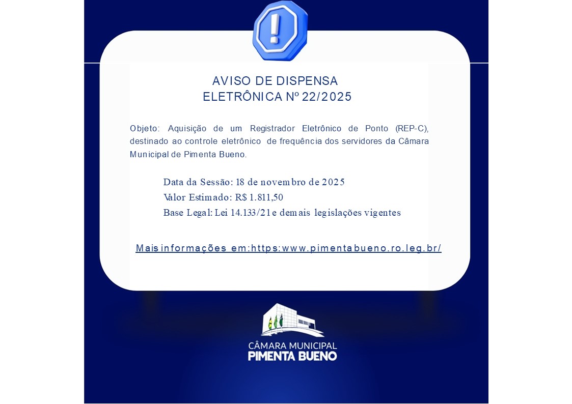 A CÂMARA MUNICIPAL DE PIMENTA BUENO, inscrita no CNPJ/MF sob o nº 84.568.872/0001-40, sediada na Av. Castelo Branco, nº 930, bairro Pioneiros, CEP: 76.970-000, torna público, para o conhecimento dos interessados que realizará Dispensa de Licitação para a aquisição de mini salgados e outros gêneros para coffee break, com a finalidade de atender a eventos institucionais da Câmara Municipal de Pimenta Bueno.