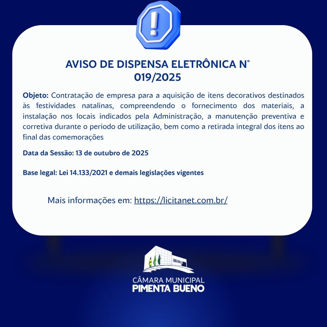 A CÂMARA MUNICIPAL DE PIMENTA BUENO, inscrita no CNPJ/MF sob o nº 84.568.872/0001-40, sediada na Av. Castelo Branco, nº 930, bairro Pioneiros, CEP: 76.970-000, torna público, para o conhecimento dos interessados que realizará Dispensa de Licitação para a Aquisição de Materiais de CFTV, e Equipamentos de Informática.