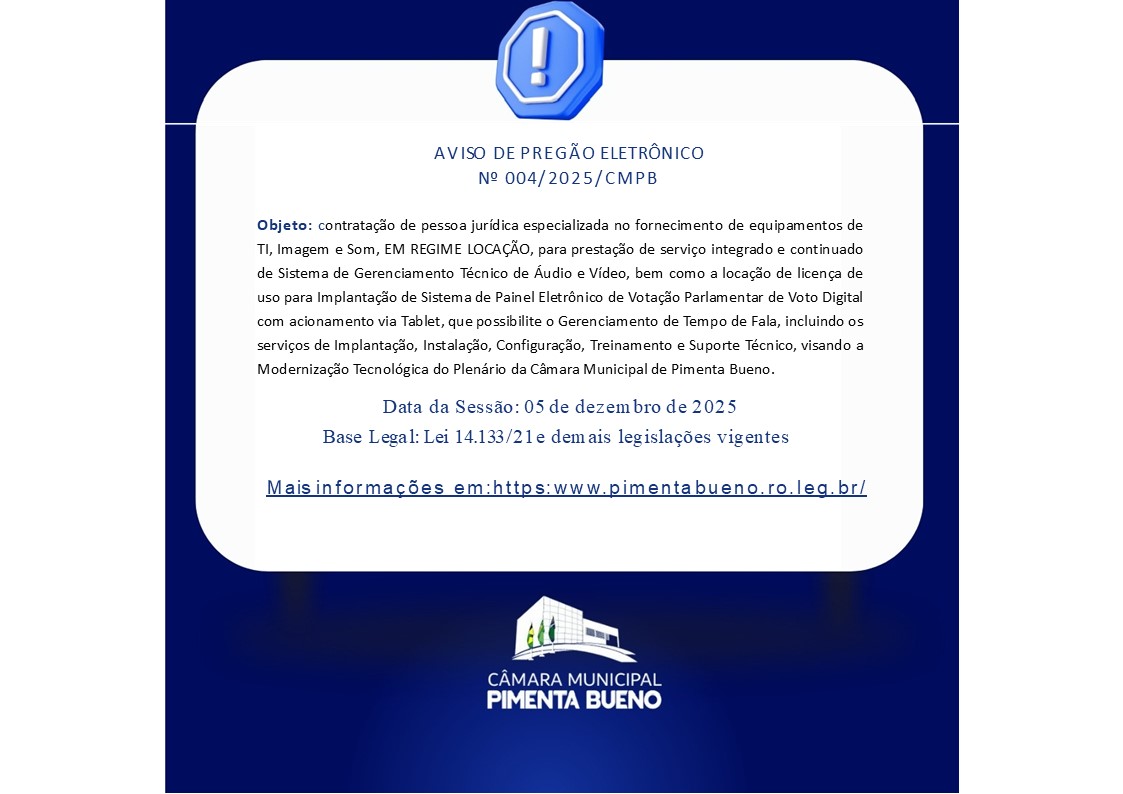Objeto: CONTRATAÇÃO DE PESSOA JURÍDICA ESPECIALIZADA no fornecimento de equipamentos de TI, Imagem e Som, EM REGIME LOCAÇÃO, para prestação de serviço integrado e continuado de Sistema de Gerenciamento Técnico de Áudio e Vídeo, bem como a locação de licença de uso para Implantação de Sistema de Painel Eletrônico de Votação Parlamentar de Voto Digital com acionamento via Tablet, que possibilite o Gerenciamento de Tempo de Fala, incluindo os serviços de Implantação, Instalação, Configuração, Treinamento e Suporte Técnico, visando a Modernização Tecnológica do Plenário da Câmara Municipal de Pimenta Bueno.