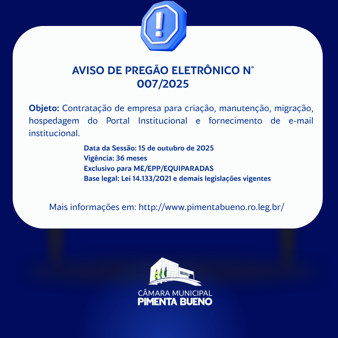 A Câmara Municipal de Pimenta Bueno, através de seu Pregoeiro, designado por força das disposições contidas na Portaria nº 027/2024/CMPB/GP, torna público para conhecimento dos